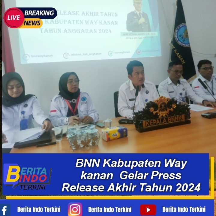 Way kanan - Beritaindoterkini.com -Badan Narkotika Nasional (BNN) Kabupaten Way Kanan menggelar press release akhir tahun pada Desember 2024 untuk memaparkan pencapaian dan langkah strategis dalam pencegahan, pemberantasan, penyalahgunaan, dan peredaran gelap narkotika (P4GN),Senin 30/12/24.